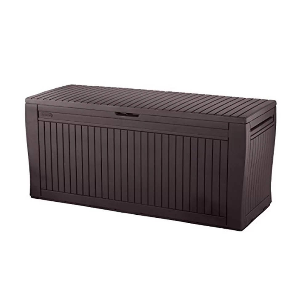 Baule in resina Comfy da esterno color marrone, resistente agli agenti atmosferici e ai raggi UV. Con sistema di ventilazione per mantenere il contenuto sempre asciutto ed aerato. Capacità 270 litri. Montaggio semplice e veloce.
