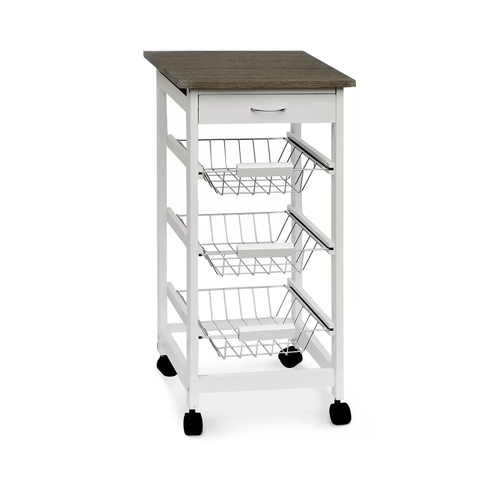 Carrello da cucina bianco in pino e bamboo. Il piano superiore è realizzato in bamboo, resistente all’usura e trattato per l’utilizzo in cucina. La struttura è in pino, verniciato di bianco. È un carrello classico con 3 cestelli portatutto. Il carrello, inoltre, è dotato di un comodo cassetto per riporre gli attrezzi da cucina. Nei 3 cestelli è possibile contenere alimenti, accessori e attrezzatura. I cestelli sono estraibili.