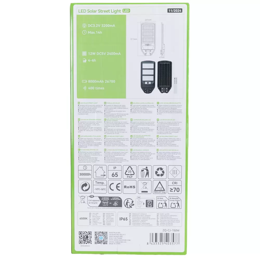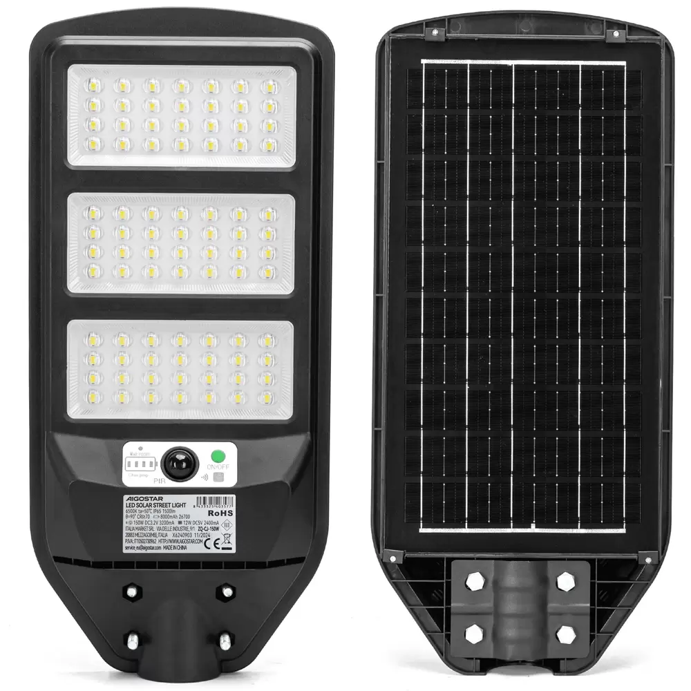 Grazie al grado di protezione IP65, questo lampione è costruito per resistere alle intemperie, alla polvere e all’umidità, assicurando prestazioni affidabili e durature nel tempo. Facile da installare e completamente autonomo, rappresenta la soluzione ideale per chi desidera un sistema di illuminazione stradale potente, ecologico e sicuro.