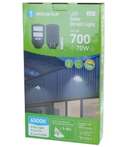 Lampione stradale Led 70W Nero con pannello solare IP65 Bianco freddo 6500K con sensore crepuscolare e di movimento Aigostar
