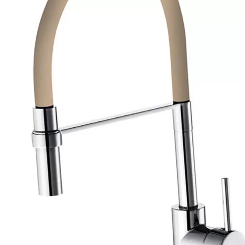 Il Miscelatore Lavello Winter combina eleganza e funzionalità, realizzato in ottone cromato lucido. Caratterizzato da una maniglia in metallo e una canna alta in gomma con finitura tortora, questo rubinetto è dotato di una doccia estraibile e orientabile per una maggiore praticità.
