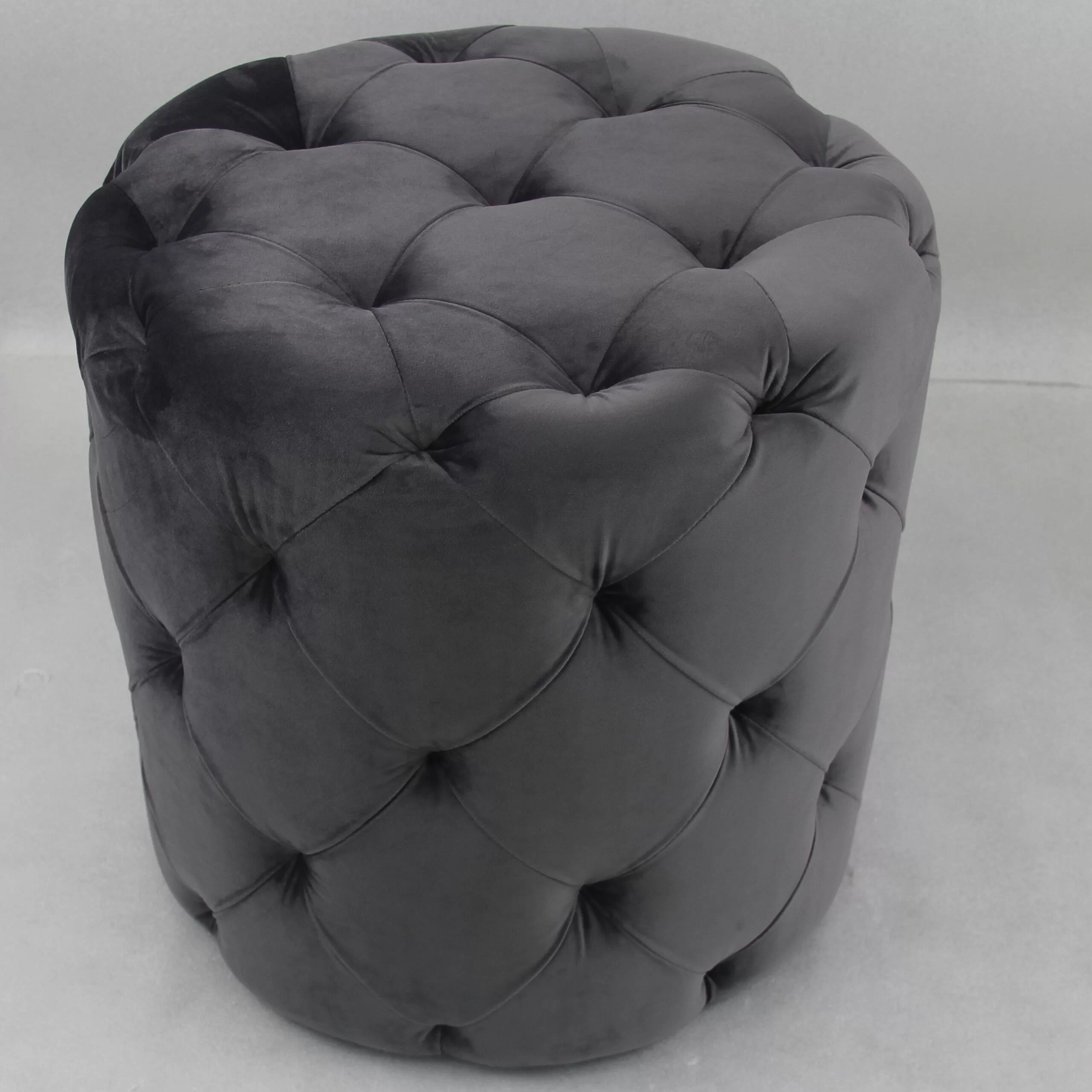 Pouff rotondo in velluto, trapuntato, grigio. Morbido e comodo, adatto al salotto e a tutti i tipi di ambienti. Facile da trasportare.