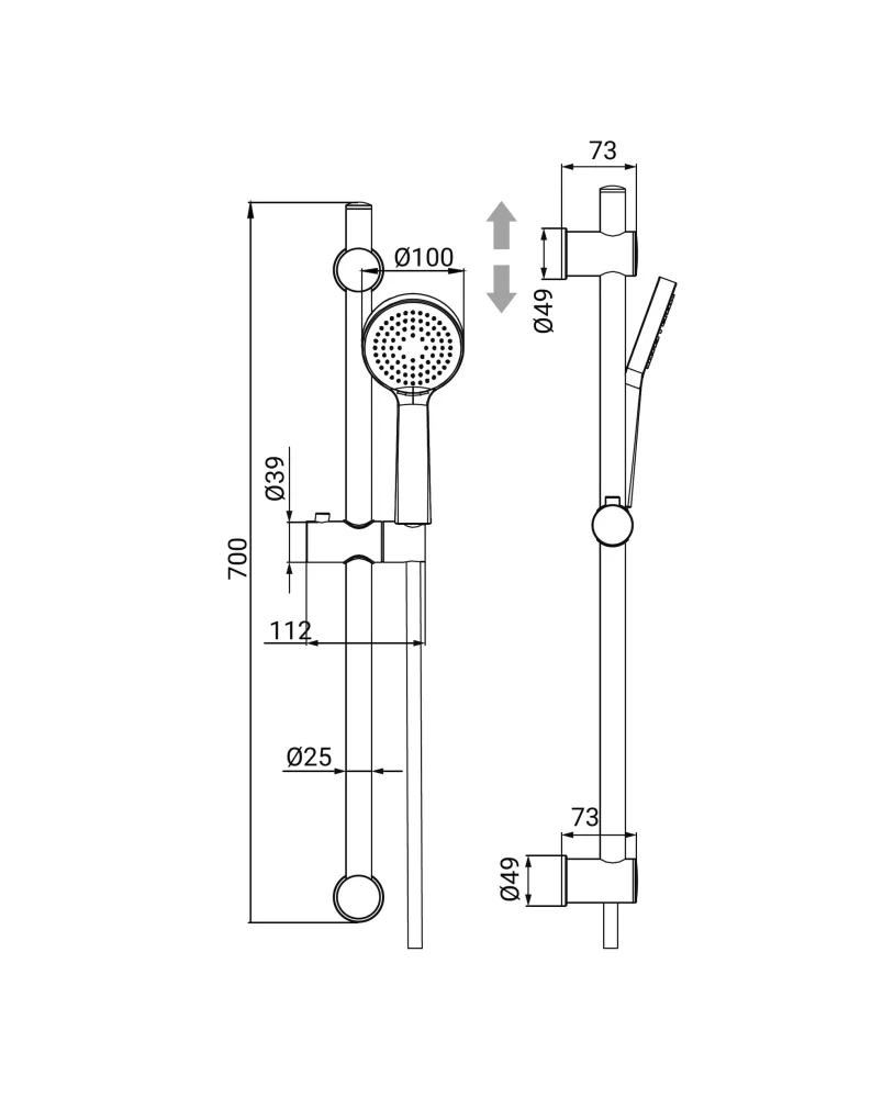 - Asta doccia: Lunghezza 700 mm, Ø 25 mm, in metallo verniciato nero