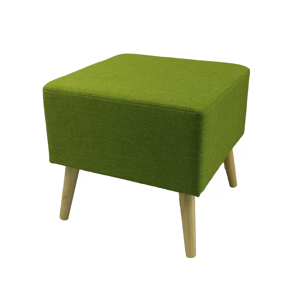 Sgabello quadrato imbottito, rivestito in tessuto. Disponibile in varie colorazioni. Con gambe in legno. Comodo pouff adatto a tutti i tipi di ambienti.