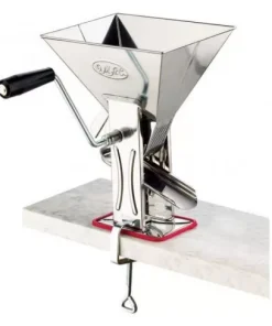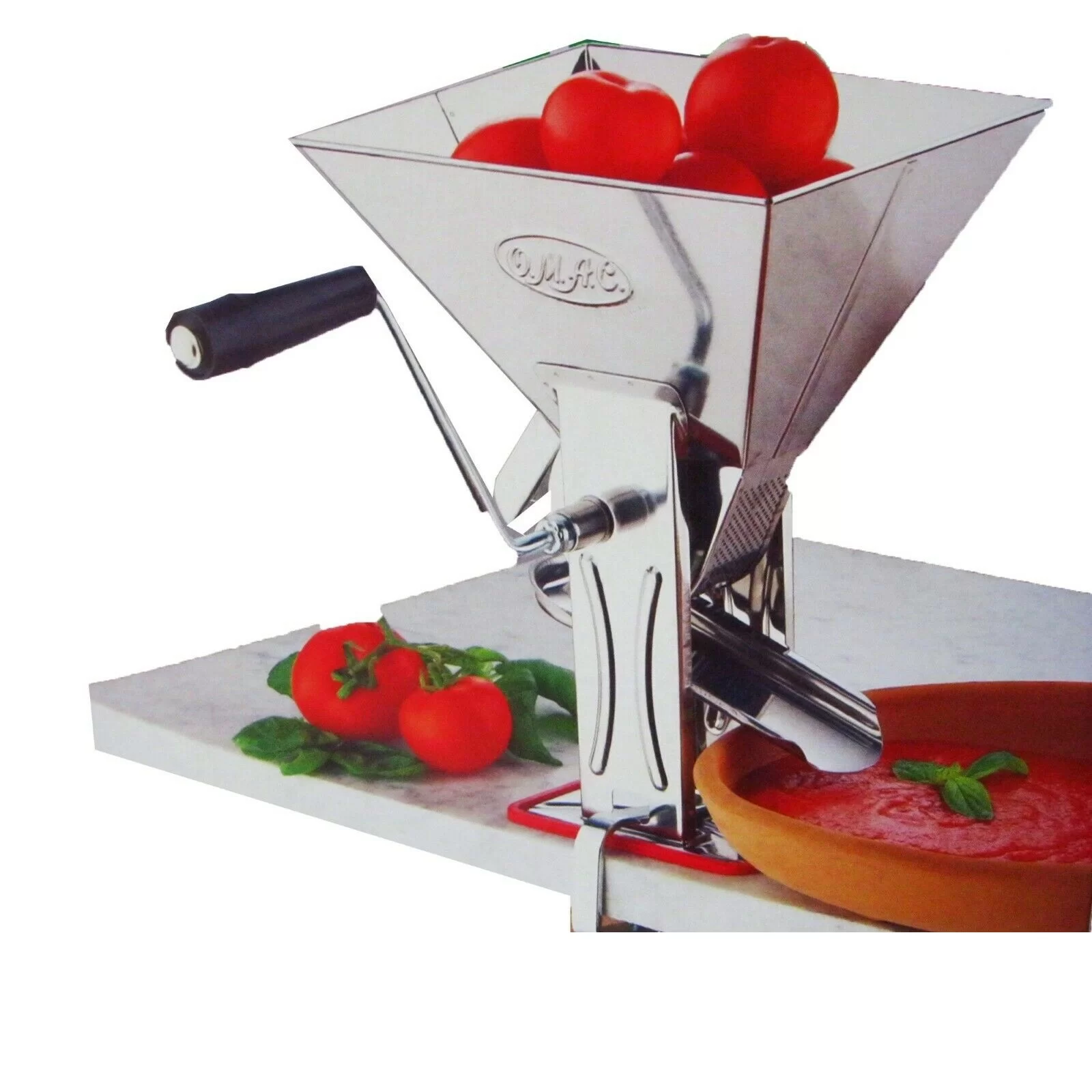 Spremipomodoro Inox Gulliver in acciaio inox 18/c. Con guarnizione salva tavolo in plastica e morsetto per il fissaggio. Rullo in alluminio. Retina in acciaio inox 18/10. Dimensioni: Cm. 17×22,5, altezza Cm. 30.